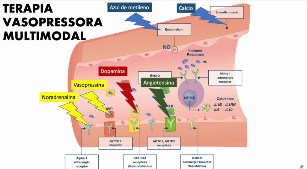 A ideia da terapia vasopressora multimodal é simples e poderosa: em vez de insistir só nas catecolaminas, que atuam em receptores adrenérgicos, utilizamos drogas que ativam mecanismos distintos de vasoconstrição. Isso não apenas poupa catecolamina, como também pode trazer efeitos adicionais benéficos.