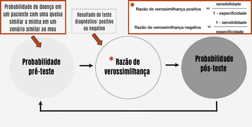 A razão de verossimilhança positiva indica o quanto um teste positivo aumenta a probabilidade de determinado diagnóstico, enquanto a razão de verossimilhança negativa expressa o quanto um teste negativo reduz a probabilidade dessa mesma doença.